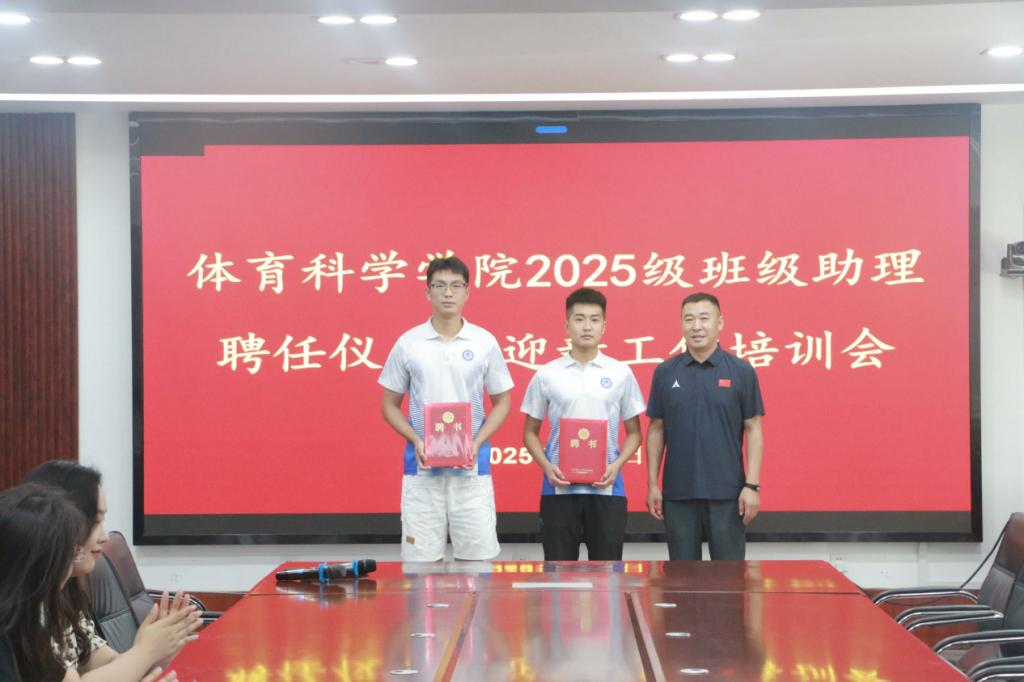 随后,马振华为于祥宝、朱承彬两位辅导员助理颁发聘书,对其即将承担的工作寄予期许。刘京与周晗共同为体育教育专业的班级助理颁发聘书,郗来军与袁瑞霖为足球运动、运动训练专业的班级助理颁发聘书。