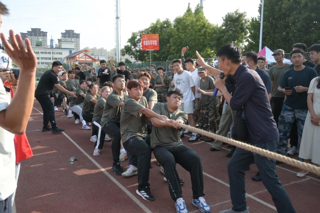 与数学科学学院陷入激烈僵持,绳索标记在中线附近来回拉扯,现场气氛紧张到极点。辅导员栾永鑫始终保持冷静,在赛场边精准指导:“一!二!一!二!”队员们紧攥绳索、牢记要领,凝聚全部力量,最终冲破僵局、连胜两场,成功斩获本次军训拔河比赛第一名!