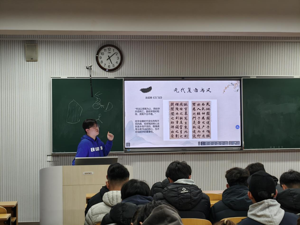 团课伊始,袁瑞霖围绕书法艺术的文化内涵展开讲解。他指出,书法“无色而有图画之灿烂,无声而有音乐之和谐”。随后,他结合具体书法作品,从笔法传承、审美意境等方面,阐释了书法艺术中蕴含的“自强不息、厚德载物”的民族精神,引导学员们从笔墨间感受传统文化的独特魅力。